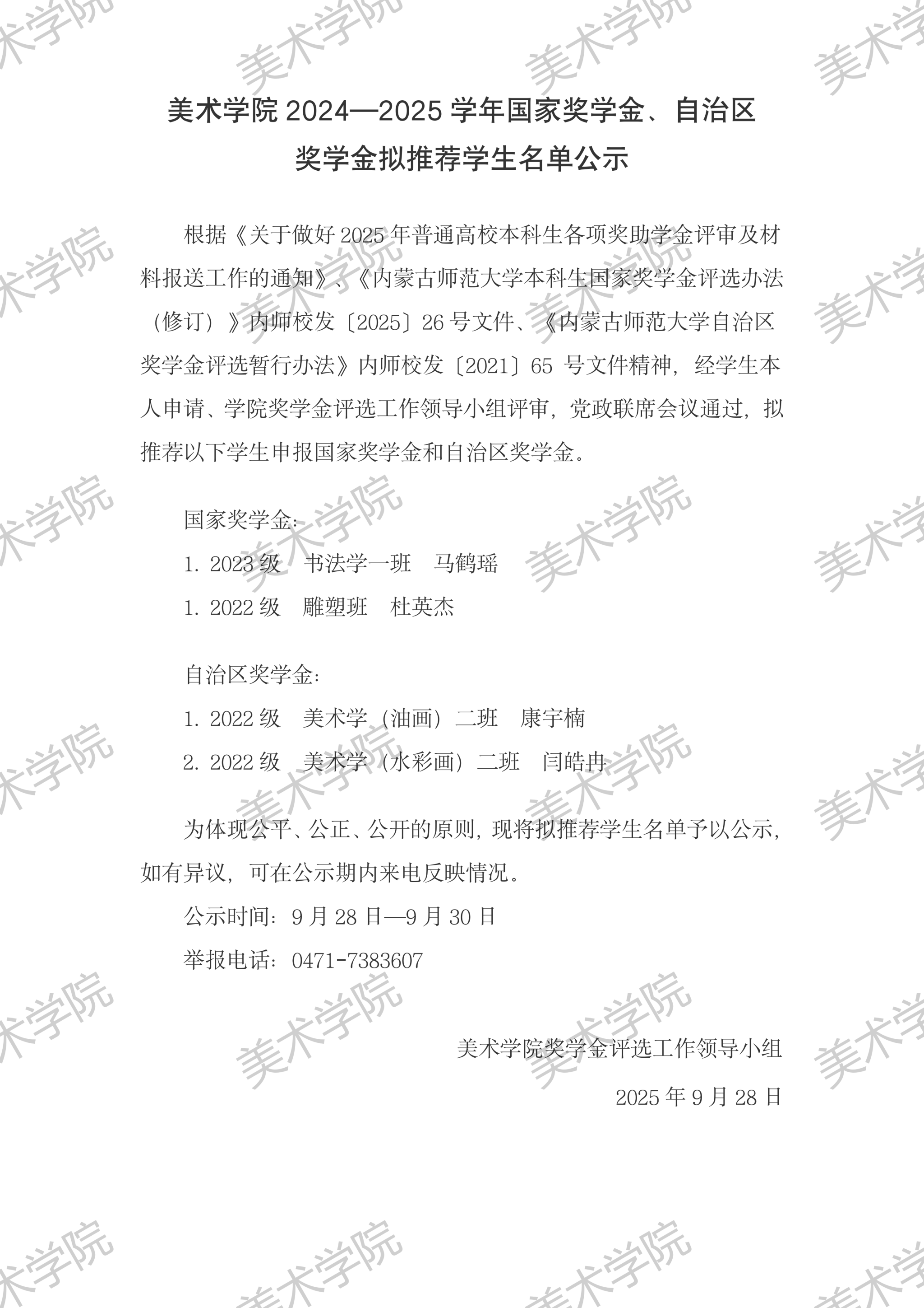 美术学院 2024-2025 学年国家奖学金、自治区奖学金拟推荐学生名单公示